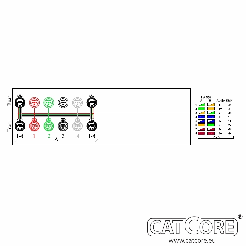 STECKERTYPEN UND KANALZUORDNUNG : Vorderseite: 2x Ethercon, 4x XLR 3pol male, Kanal 1-4. Rückseite: 2x Ethercon, 4x XLR 3pol female, Kanal 1-4. Pinbelegung Ethercon/RJ45 nach CatCore Standard.