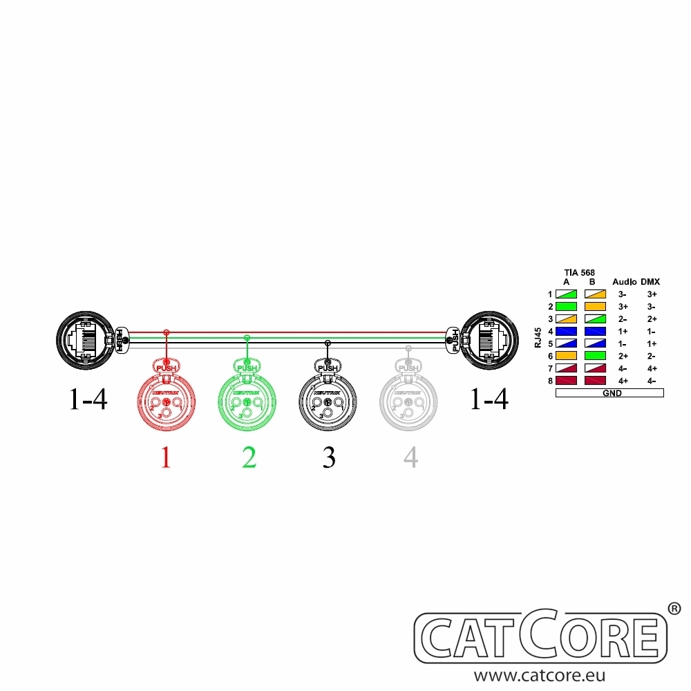 STECKERTYPEN UND KANALZUORDNUNG : 2x Ethercon, 4x XLR 3pol female / 6,3mm Klinke Combicon , Kanal 1-4. Pinbelegung Ethercon/RJ45 nach CatCore Standard.
