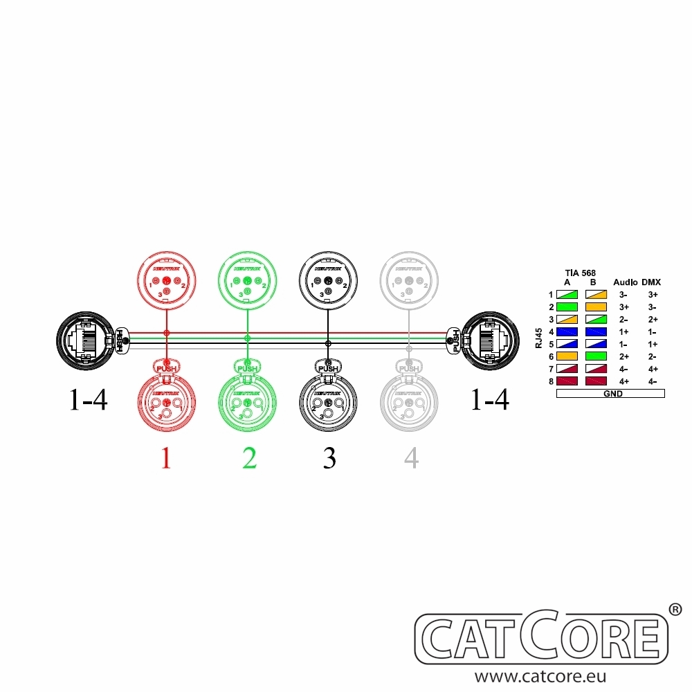 STECKERTYPEN UND KANALZUORDNUNG : 2x Ethercon, 4x XLR 5pol male, 4x XLR 5pol female, Kanal 1-4. Pinbelegung Ethercon/RJ45 nach CatCore Standard.